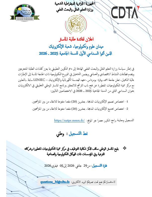 تعلن جامعة أمحمد بوقرة بومرداس معهد الهندسة الكهربائية و الإلكترونيك بالتعاون مع مركز تنمية التكنولوجيات المتطورة عن فتح باب الترشح للالتحاق ببرنامج الليسانس الوطني التطبيقي في الإلكترونيات بعنوان السداسي الرابع من السنة الجامعية 2025 - 2026 في الاختصاصين التاليين:
