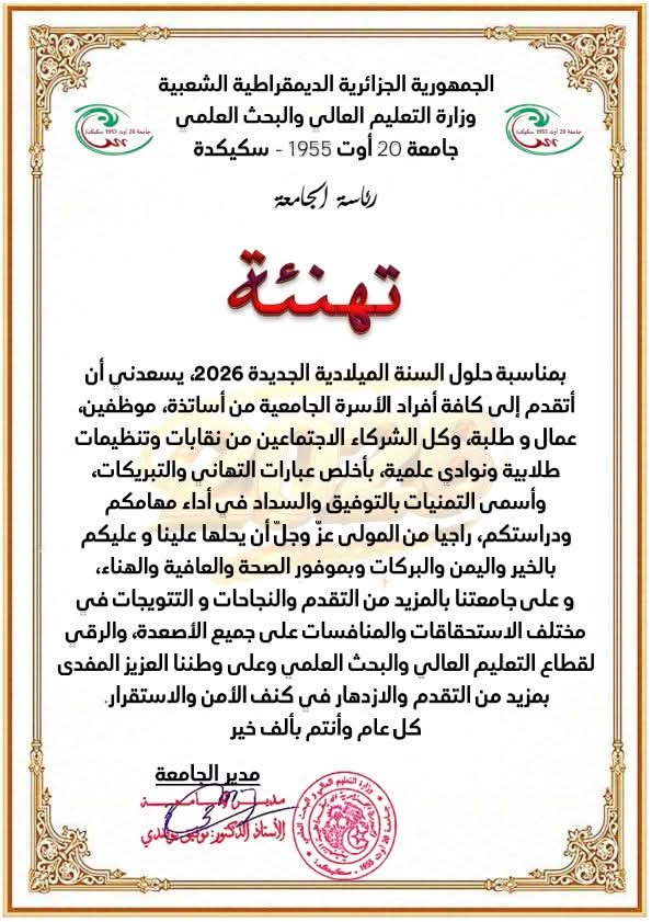 بمناسبة حلول العام الجديد 2026، يتقدّم السيد مدير جامعة 20 أوت 1955 سكيكدة البرفيسور بوفندي توفيق، بأصدق عبارات التهاني وأطيب التمنيات إلى كافة مكوّنات الأسرة الجامعية من أساتذة وطلبة وموظفين وعمال و كافة الشركاء الإجتماعيين من نقابات ، تنظيمات طلابية ونوادي علمية ، راجيا من المولى عز وجل أن يحلها علينا وعليكم بالخير واليمن و البركات وبموفور الصحة و العافية والهناء ، كل عام وأنتم بخير، ودامت جامعة سكيكدة صرحًا للعلم ومنارةً للمعرفة ومجالًا لصناعة المستقبل وخدمة التنمية الوطنية .