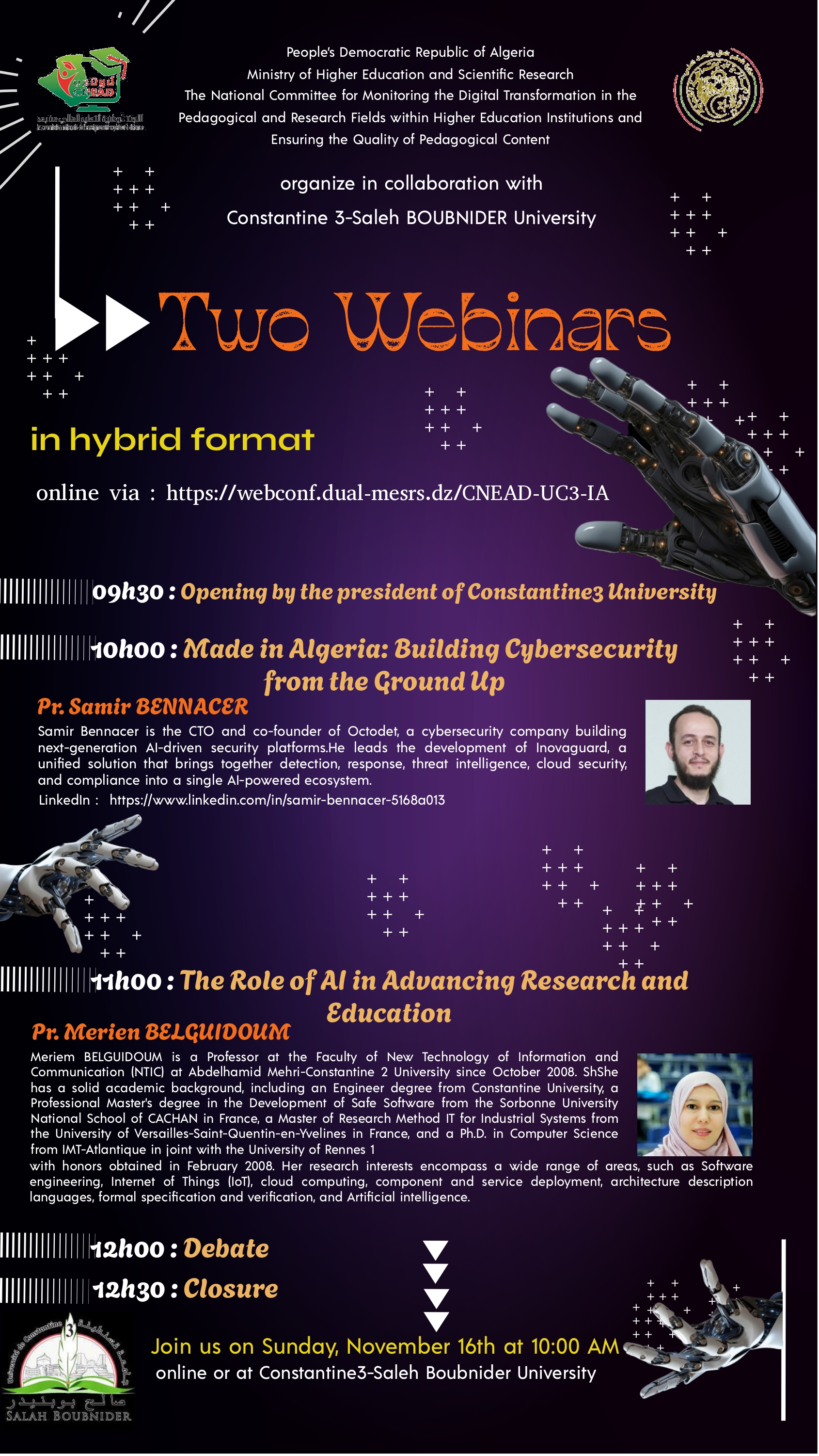 في إطار سلسلة الندوات عبر الأنترنت التي نظمتها خلية الذكاء الاصطناعي التابعة للجنة الوطنية للتعليم عن بعد (CNEAD) يومي 22 أبريل و12 مايو 2025، يسرّنا أن نعلن عن تنظيم الندوة الإلكترونية الثالثة، التي ستُعقد يوم 16 نوفمبر 2025، بالشراكة مع جامعة قسنطينة 3 (البرنامج المرفق).