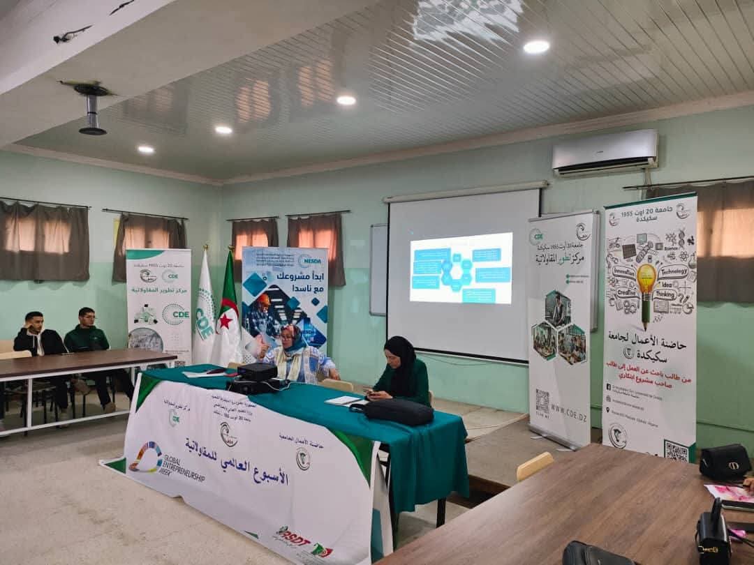 تواصلت لليوم الثاني على التالي فعاليات الأسبوع العالمي للمقاولاتية بجامعة سكيكدة ، تحت إشراف السيد مدير الجامعة البرفيسور بوفندي توفيق وبتأطير وتنظيم كل من مركز تطوير المقاولاتية وحاضنة الاعمال الجامعية، أين تم تقديم جملة من الورشات والمحاضرات والتي تهدف إلى تعزيز المعارف التطبيقية لدى الطلبة وتزويدهم بآليات حقيقية لإنشاء مشاريعهم.