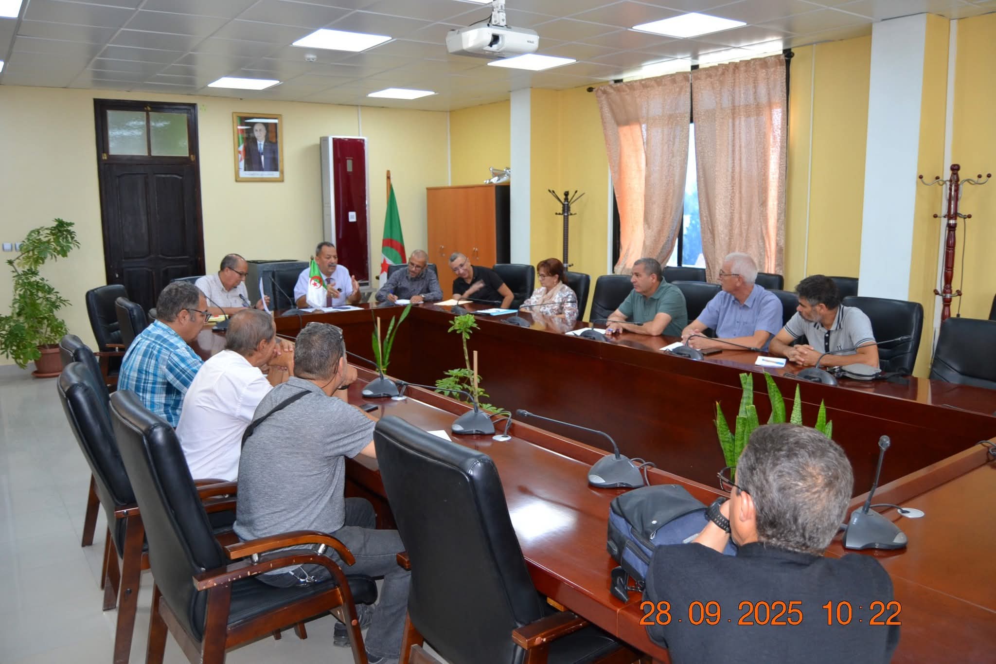 عقد صبيحة يوم الأحد 28 سبتمبر 2025 على مستوى قاعة الإجتماعات لرئاسة الجامعة السيد مدير الجامعة البروفيسور بوفندي توفيق إجتماع تنسيقي دوري مع مدراء مخابر البحث لجامعة سكيكدة وبحضور كل من السادة: ، نائب المدير المكلف بالتنمية والإستشراف والتوجيه ، نائب المدير المكلف بما بعد التدرج والطور الثالث ، نائب المدير المكلف بالعلاقات الخارجية و المدير الفرعي للمالية والمحاسبة ، حيث إفتتح اللقاء السيد مدير الجامعة مرحبا بالسادة الأساتذة مدراء المخابر والحضور مثمنا جهودهم في الرقي بالبحث العلمي والتكوين ، ليتم بعدها مناقشة عدة نقاط المدرجة في جدول الأعمال وهي: